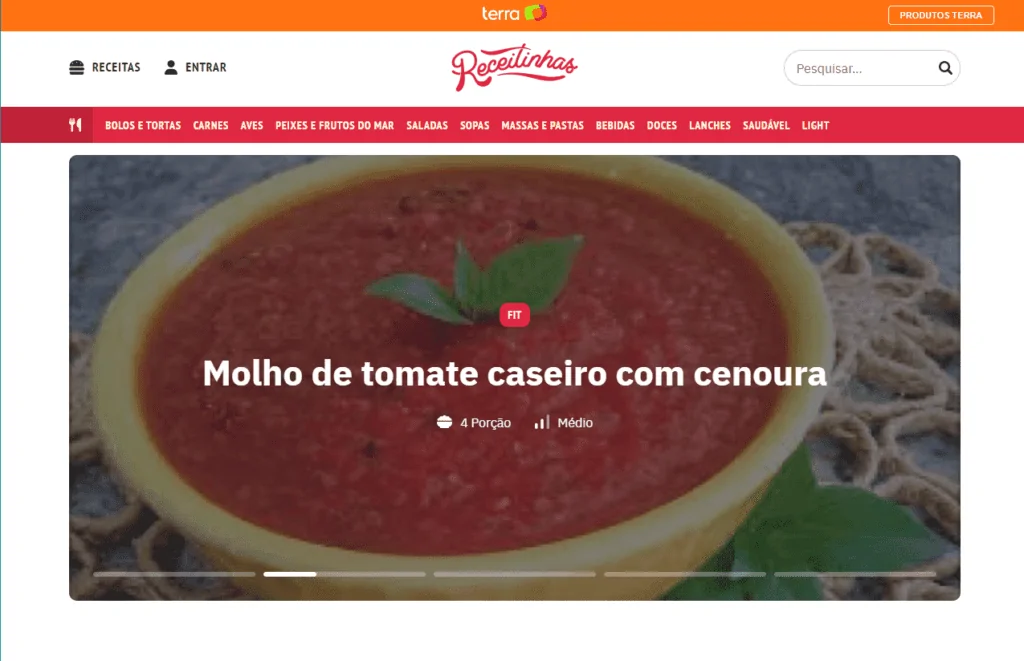 Por isso, ele é um portal bastante completo e as receitas estão divididas nas seguintes categorias: bolos e tortas, carnes, aves, frutos do mar, saladas, sopas, massas e pasta, bebidas, doces, saudável e light..